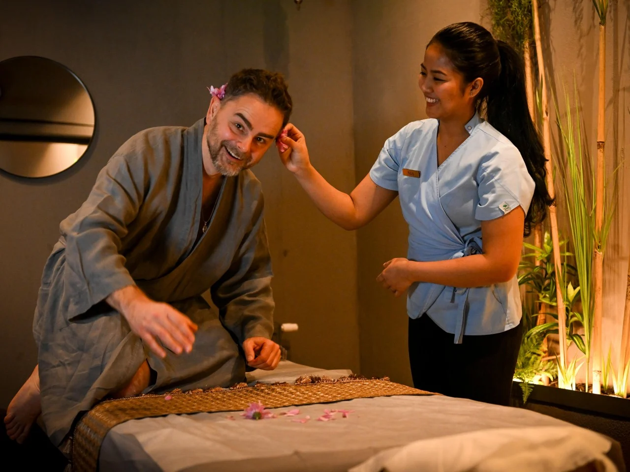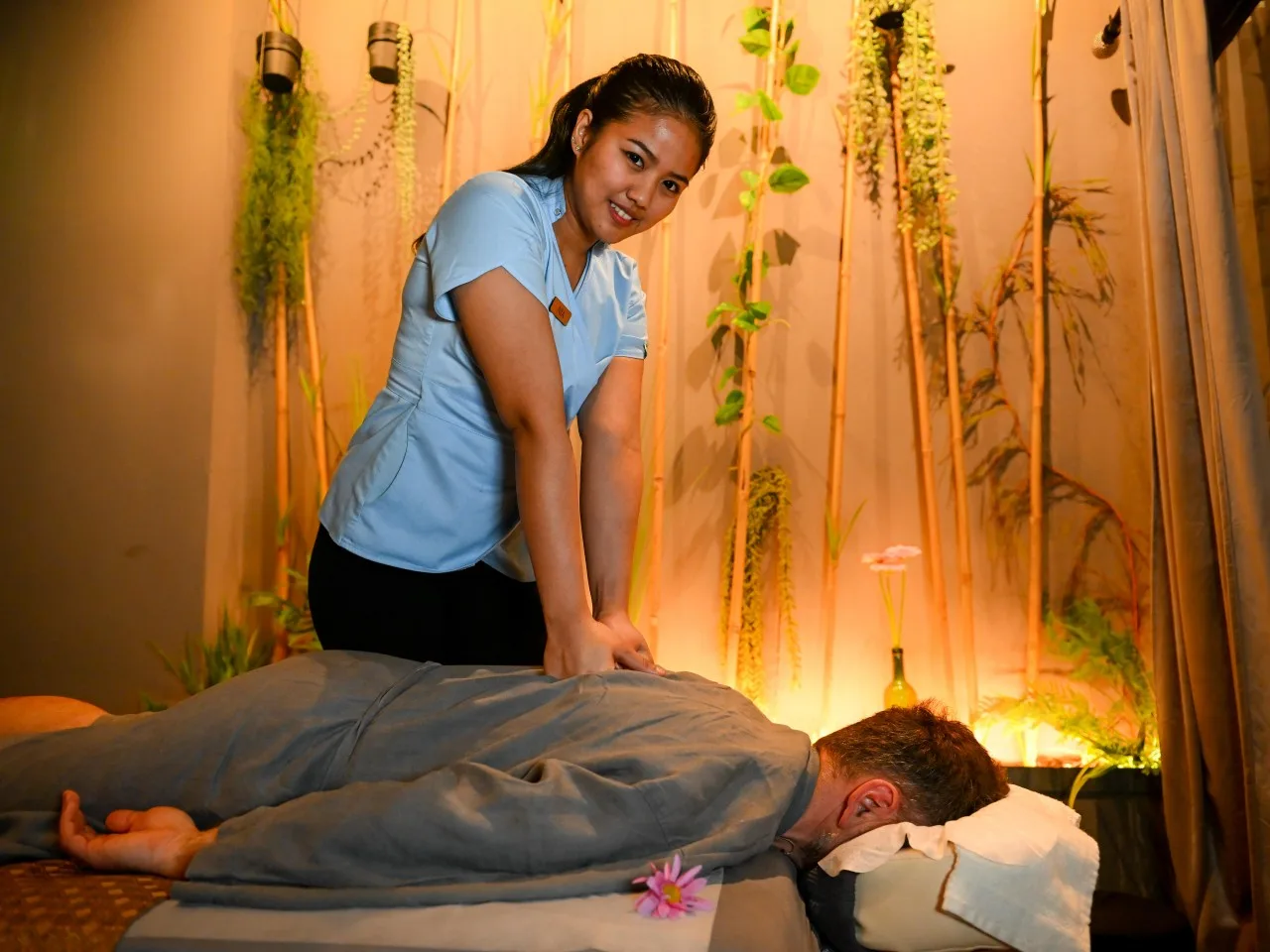 Masaż tajski dla dwojga wykonywany jest przez dwójkę masażystów jednocześnie na dwóch osobach.